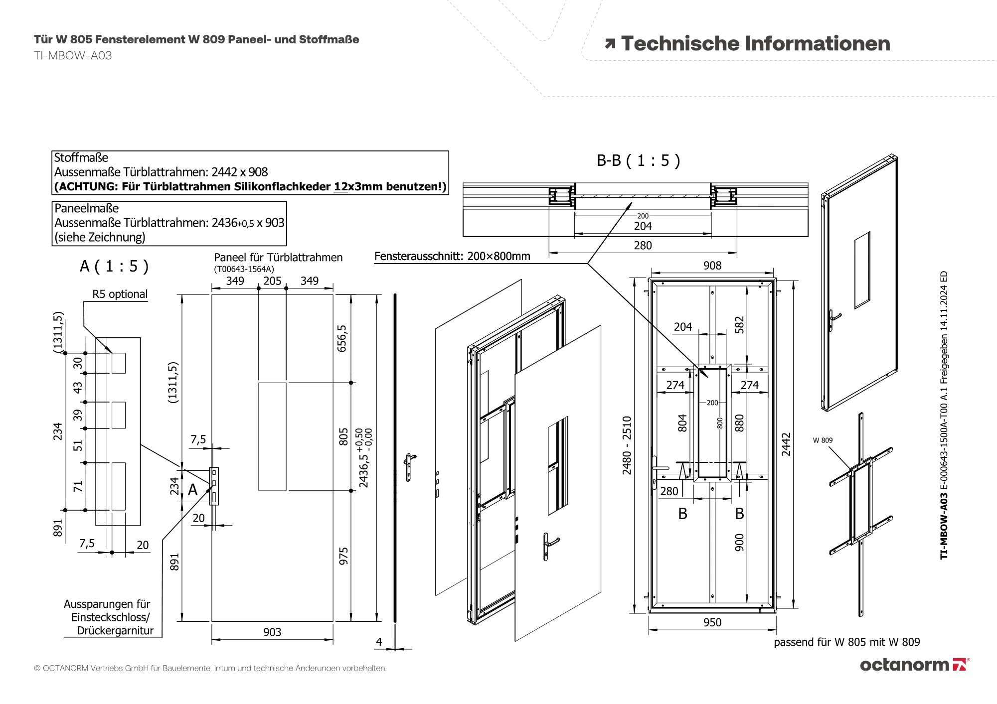 1 × Fensterelement aus W 906 für beidseitig Stoff/Paneel, zum nachträglichen Einbau in Türelement W 805, Fensterausschnitt: B 200 × H 800 mm