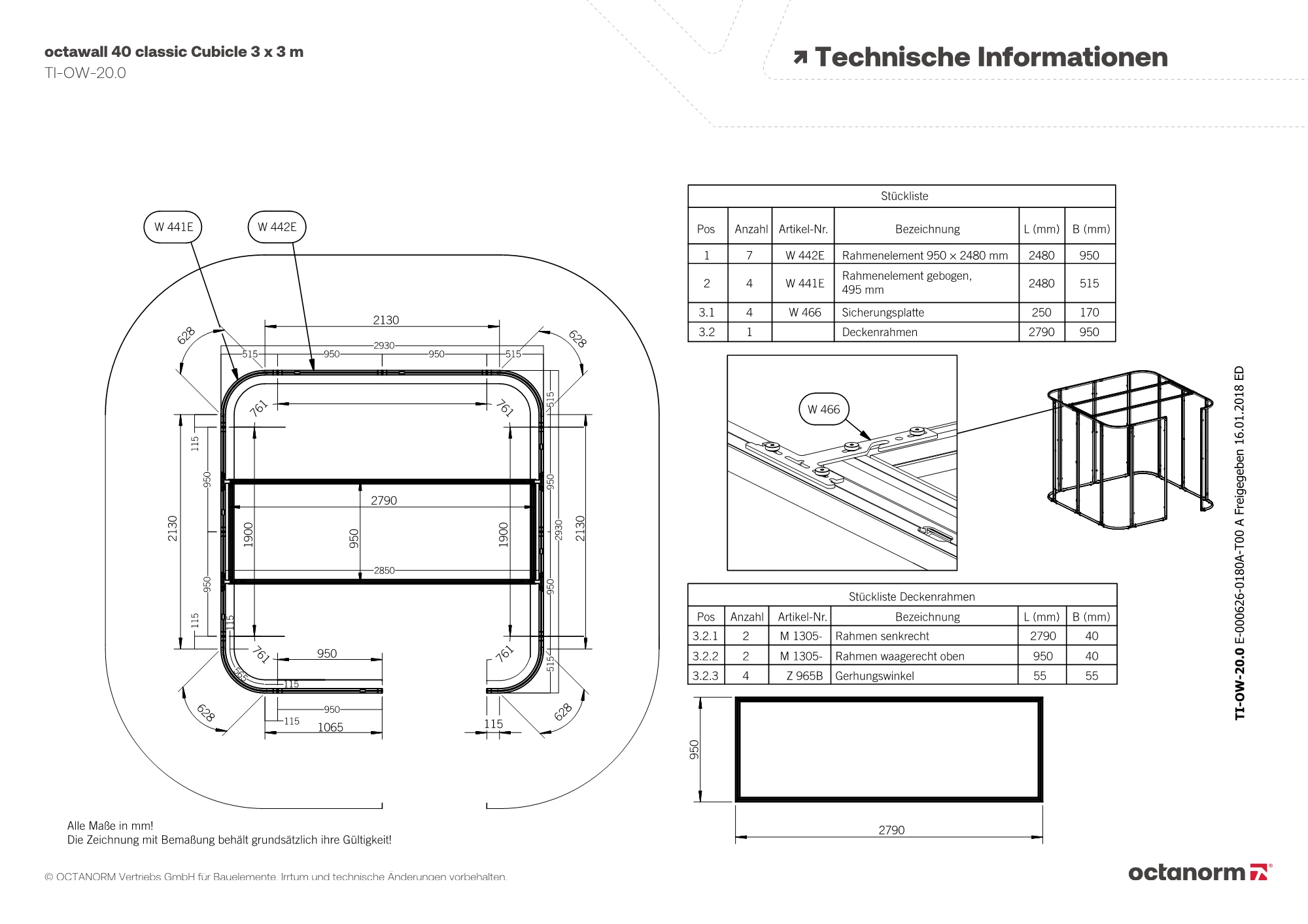 1 × Rahmen aus W 906 für beidseitig Stoff/Paneel, zum Einbau zwischen 2 Stützen, inkl. 2 × Verstellfuß C 440/F und 6 × Befestigungsset M 1477, inkl. Hakenband W 840, mit 4 × Eckverbinder W 916 (kein Gehrungsschnitt nötig), mit Bohrungen für M 1951 und M 1953, Aussparungen für Kabelführung sind auf Wunsch möglich