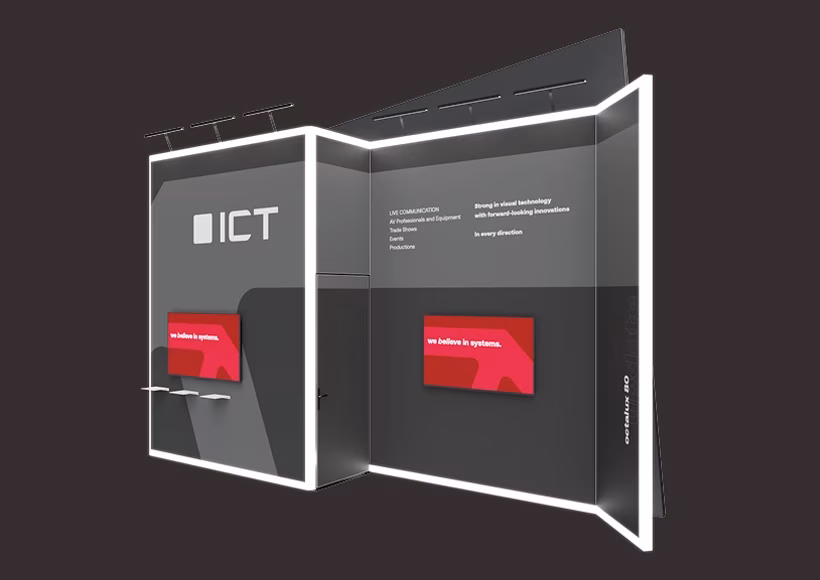 Ready-made exhibition stands in four different sizes, made from octawall pro with LED video walls and octalux as eye-catchers.