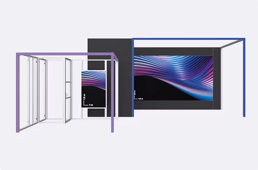Freestanding video walls made of octawall pro for a maximum playback area. Available in three sizes: 3.5 × 2.5 m / 4.5 × 3 m / 5.5 × 3.5 m.