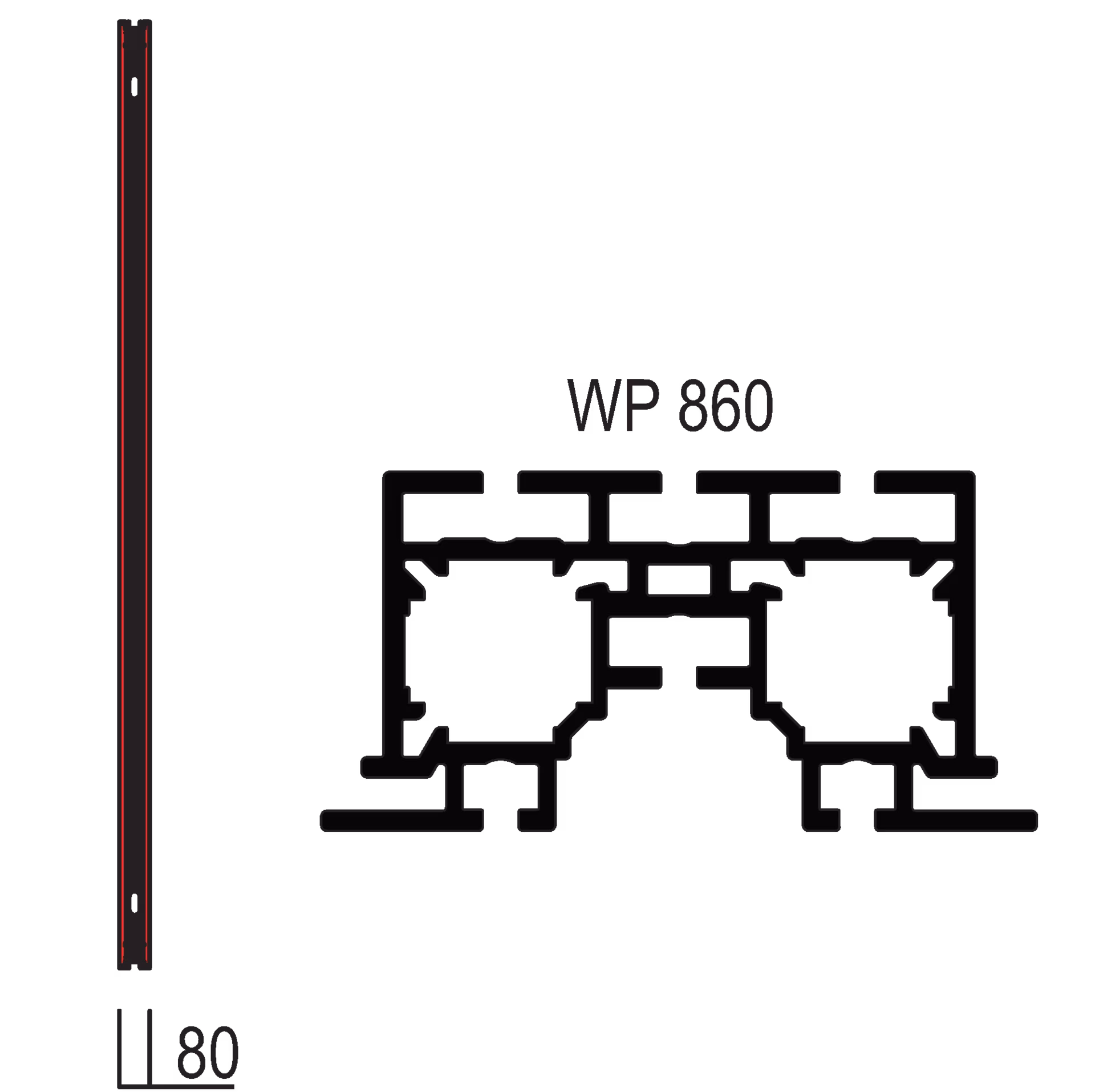 1 × frame made of WP 860 for fabric/panel on both sides, for mounting to frame or upright, with 20 × drill hole for quick connector WP 80-1 or WP 80-2, 8 × threaded hole for adjustable foot WP 80-3 and 8 × outlet for passing cables incl. protection WP 85-8