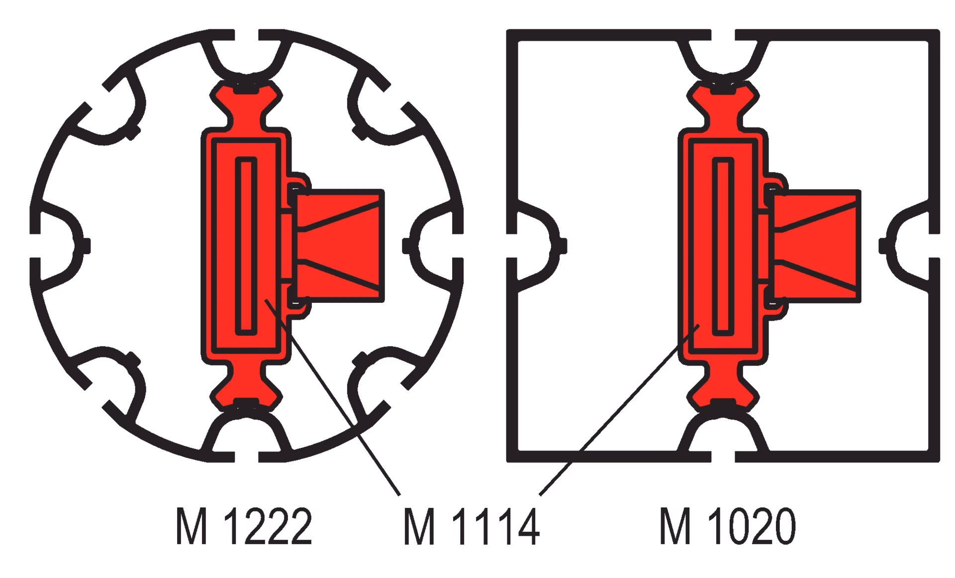 for all square and round extrusions 80 mm, incl. 1 × safety tension lock M 1161/R, 1 × collar guide M 1102/2 and 4 × countersunk screw M 1611/20 (M5)