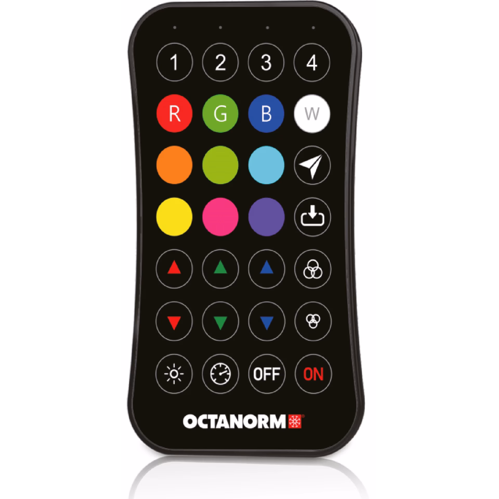 Ultra-thin RGB/RGBW HF remote control, for controlling OCTAlux products with built-in L 185-1 control unit, Output signal: RF (2.4 GHZ), Operating voltage: 3VDC (CR2032), Operating current: <5 mA, incl. OL 182B button cell (CR2032)