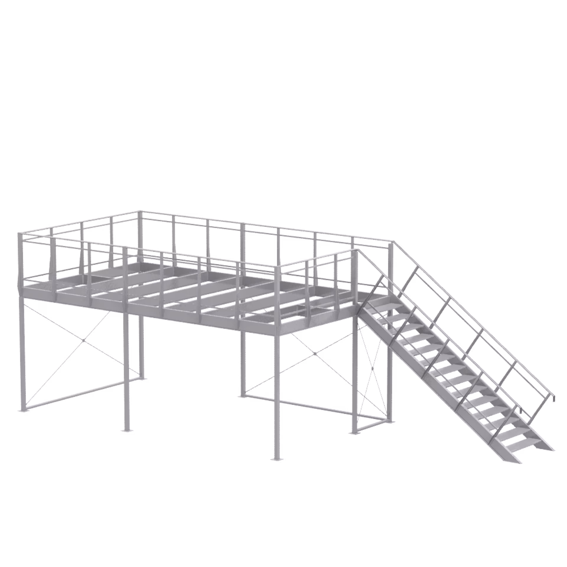 1 × basic module 4 × 4 and extension module 3 × 4, including railing supports for parapet height of 1150 mm, single flight of stairs 35° right, 14 × step DFL 532, not included: walkable floor disc (2 × 19 mm) and parapet infills