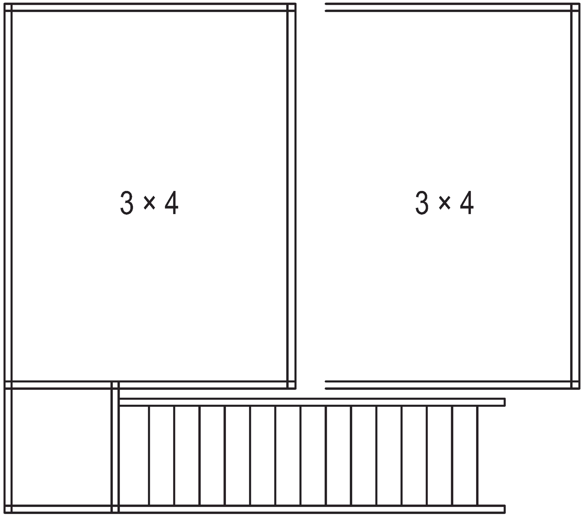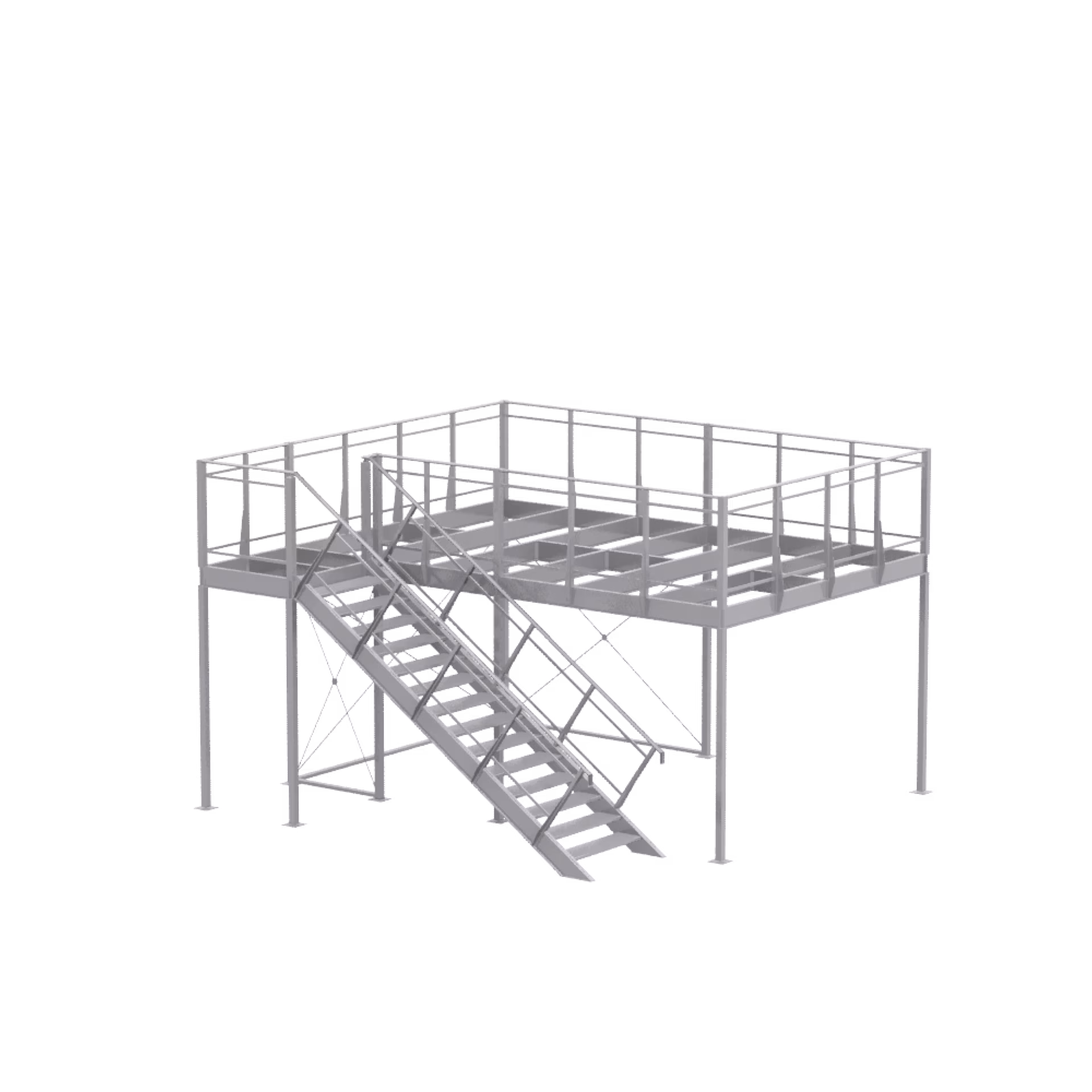 1 × basic module 3 × 4, including Staircase landing and extension module 3 × 4, railing supports for parapet height of 1150 mm, single flight of stairs 35° left, 14 × step DFL 532, not included: walkable floor disc (2 × 19 mm) and parapet infills