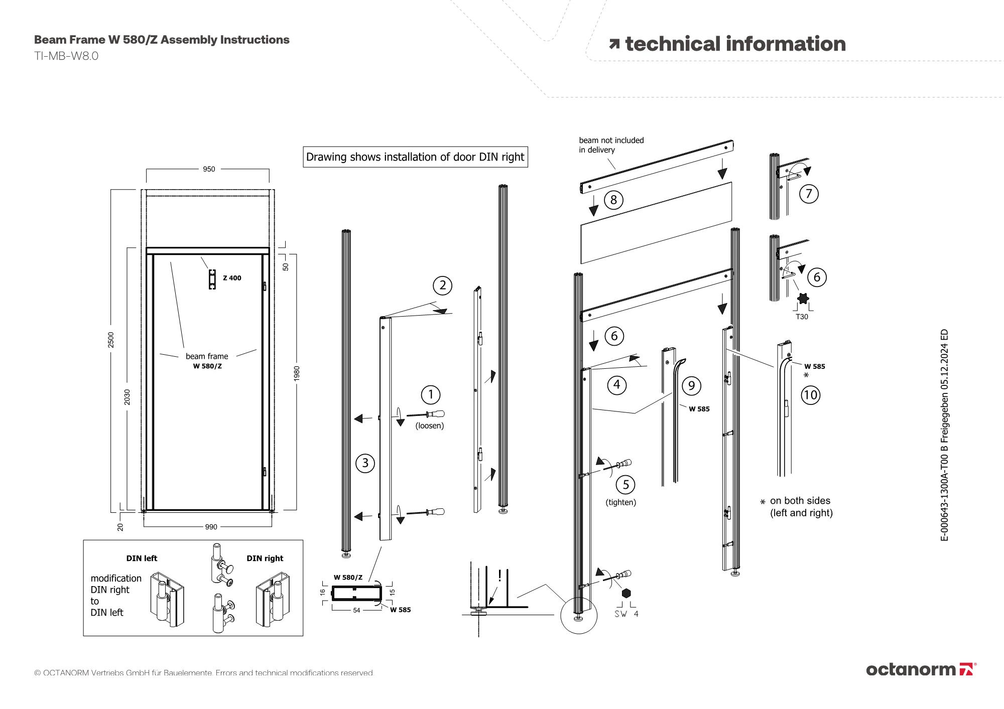 for door panel W 580 / W 581, right side, can be changed to door stop left side, incl. 1 × threshold seal W 585, assembly dimension 950 × 2030 mm