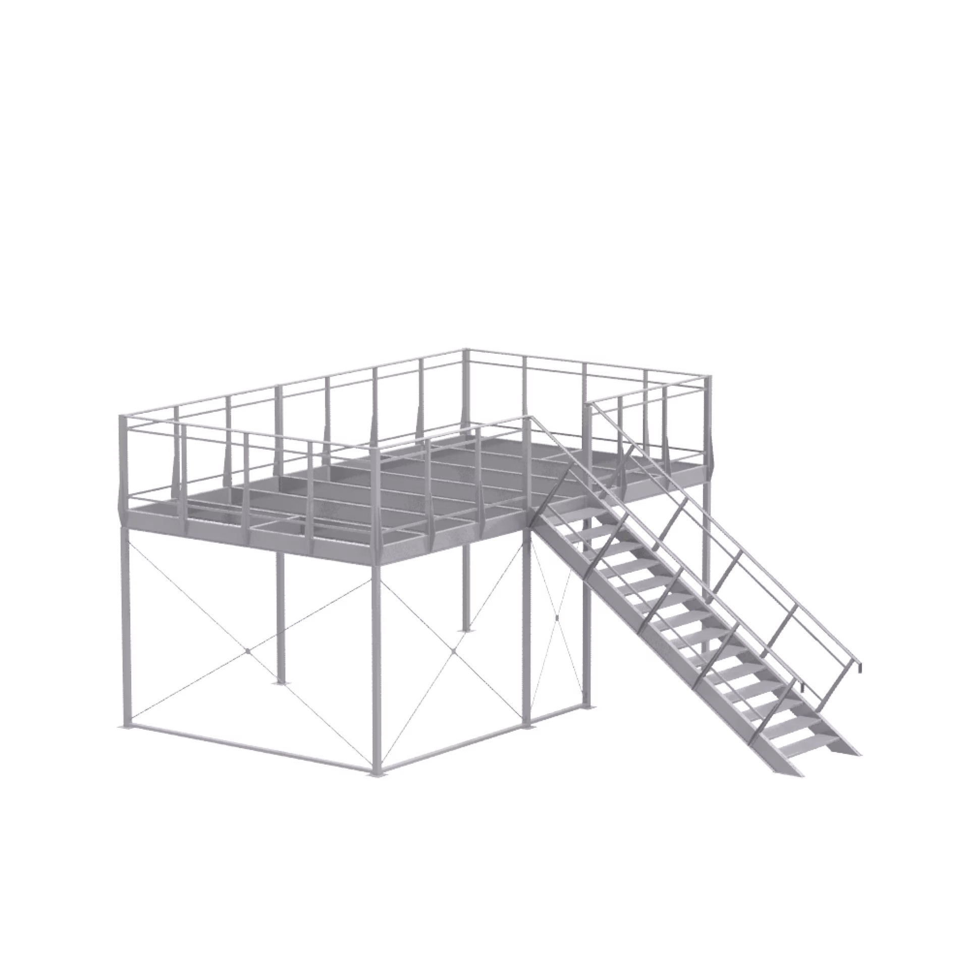1 × basic module 4 × 4 and extension module 3 × 4, including railing supports for parapet height of 1150 mm, single flight of stairs 35° left, 14 × step DFL 532, not included: walkable floor disc (2 × 19 mm) and parapet infills