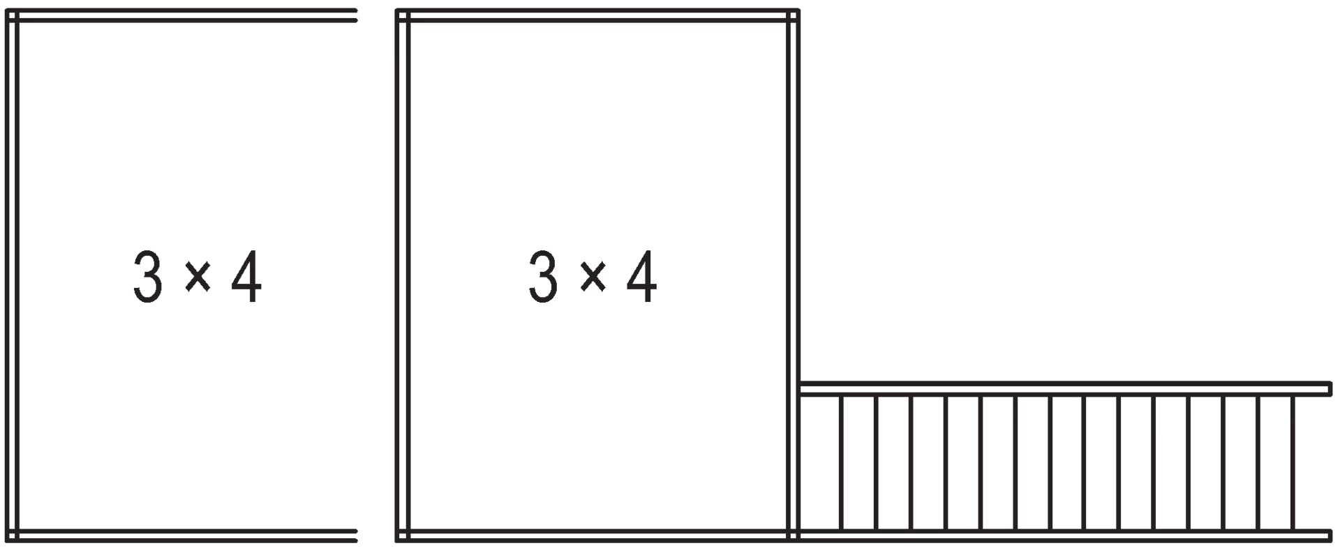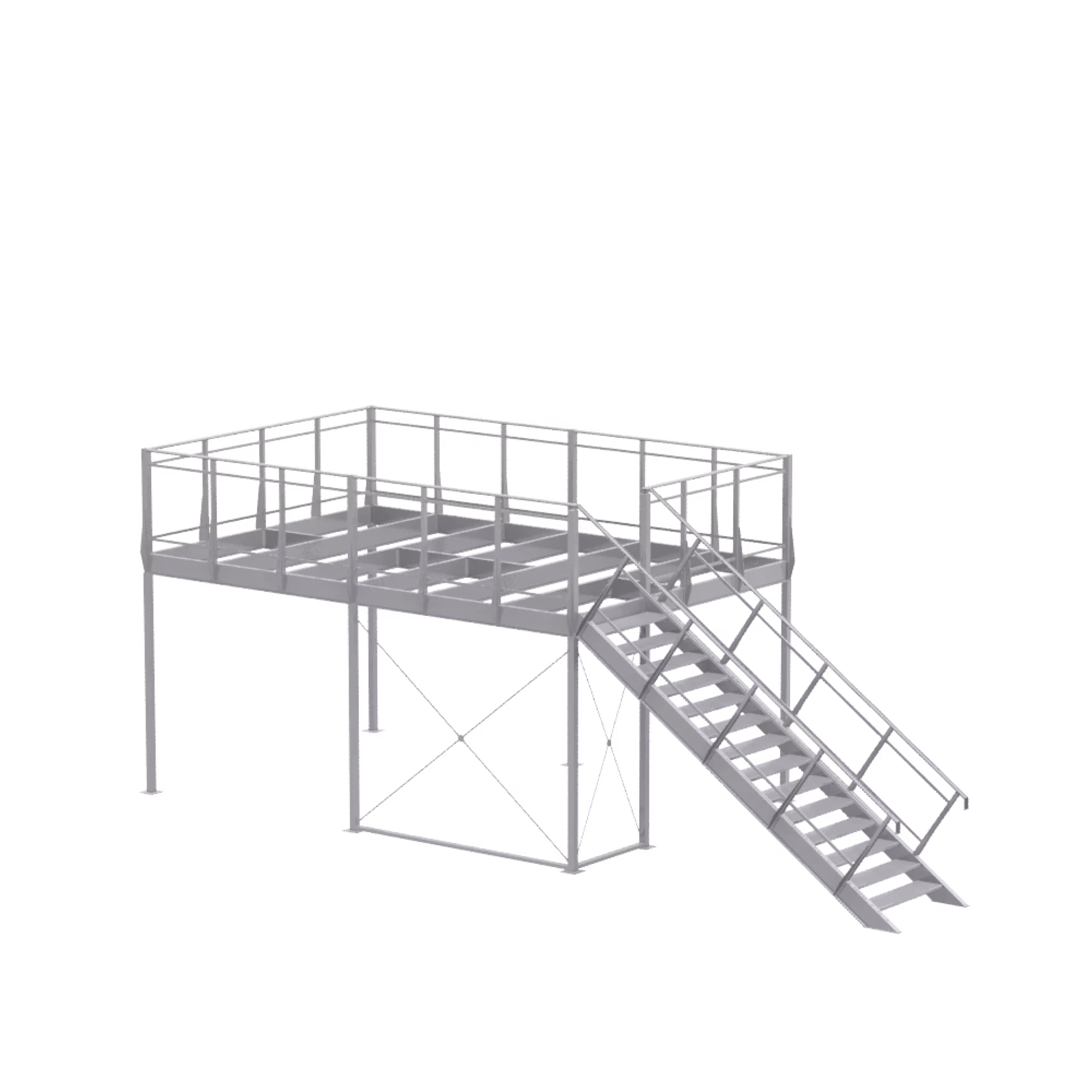 1 × basic module 3 × 4 and extension module 3 × 4, including railing supports for parapet height of 1150 mm, single flight of stairs 35° left, 14 × step DFL 532, not included: walkable floor disc (2 × 19 mm) and parapet infills