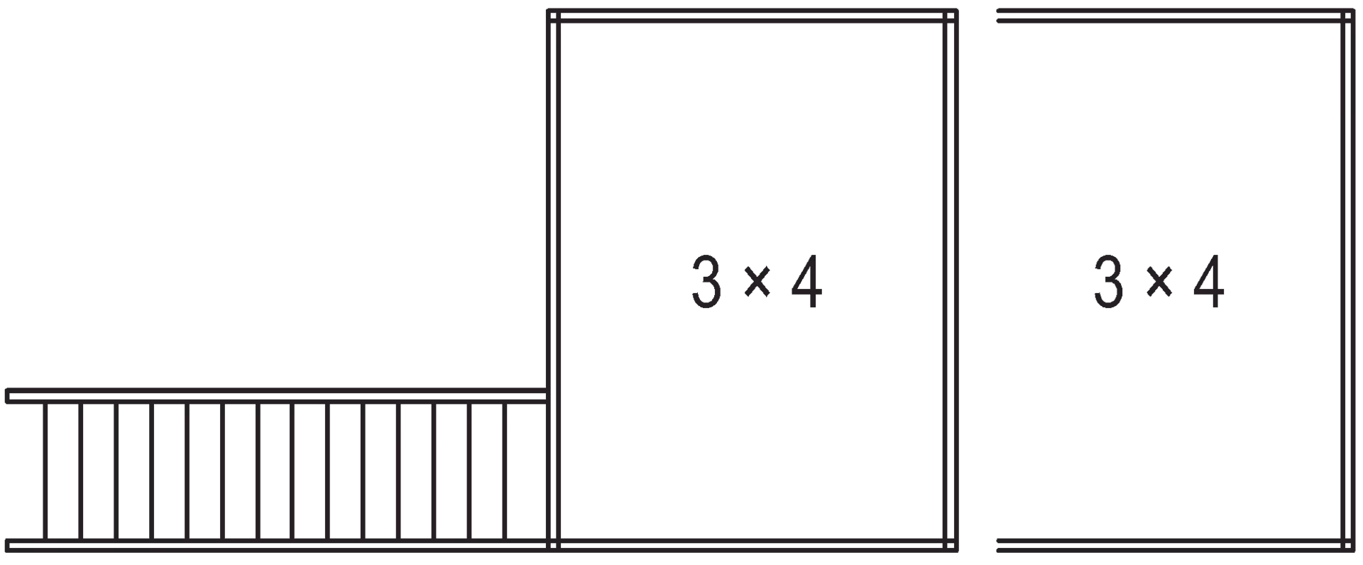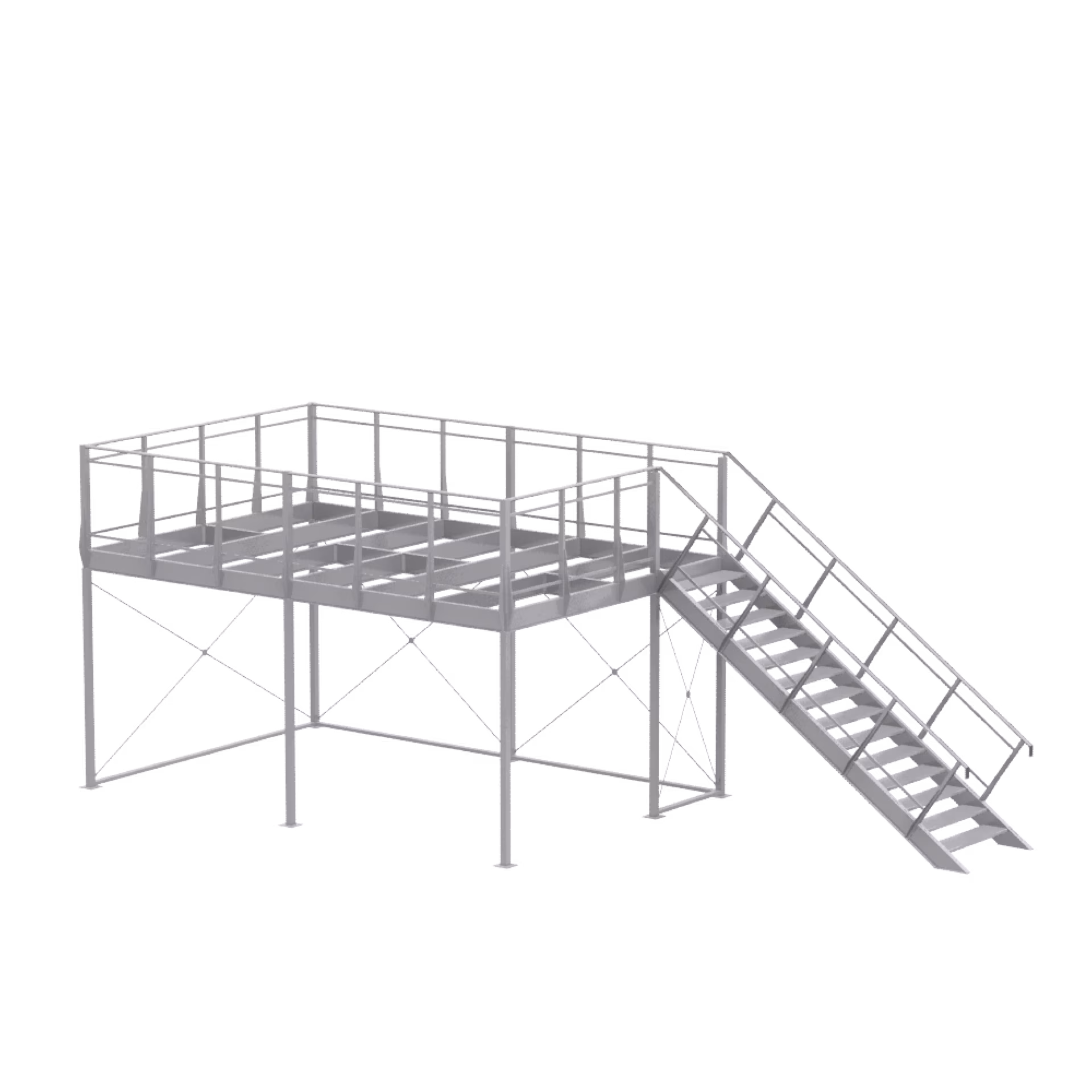 1 × basic module 3 × 4 and extension module 3 × 4, including railing supports for parapet height of 1150 mm, single flight of stairs 35° right, 14 × step DFL 532, not included: walkable floor disc (2 × 19 mm) and parapet infills