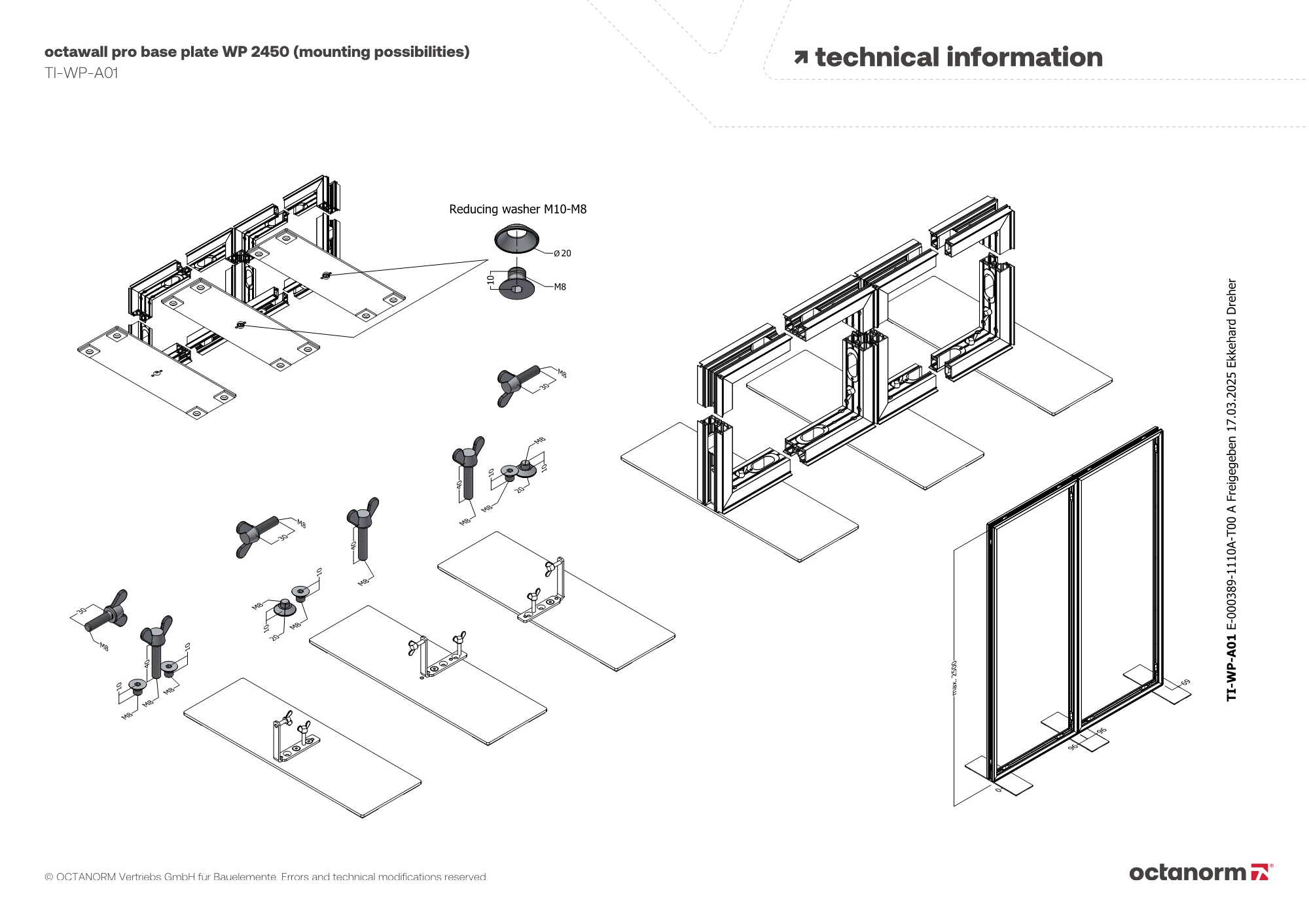 for freestanding octawall pro frames, 3 different mounting positions possible, can be used right/left/center, with 1 × WP 2472 angle bracket and 1 × WP 2476 mounting accessories, max. frame height = 2500 mm