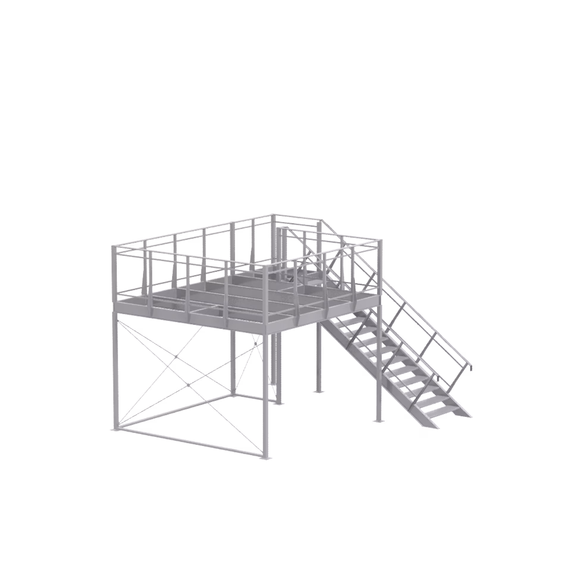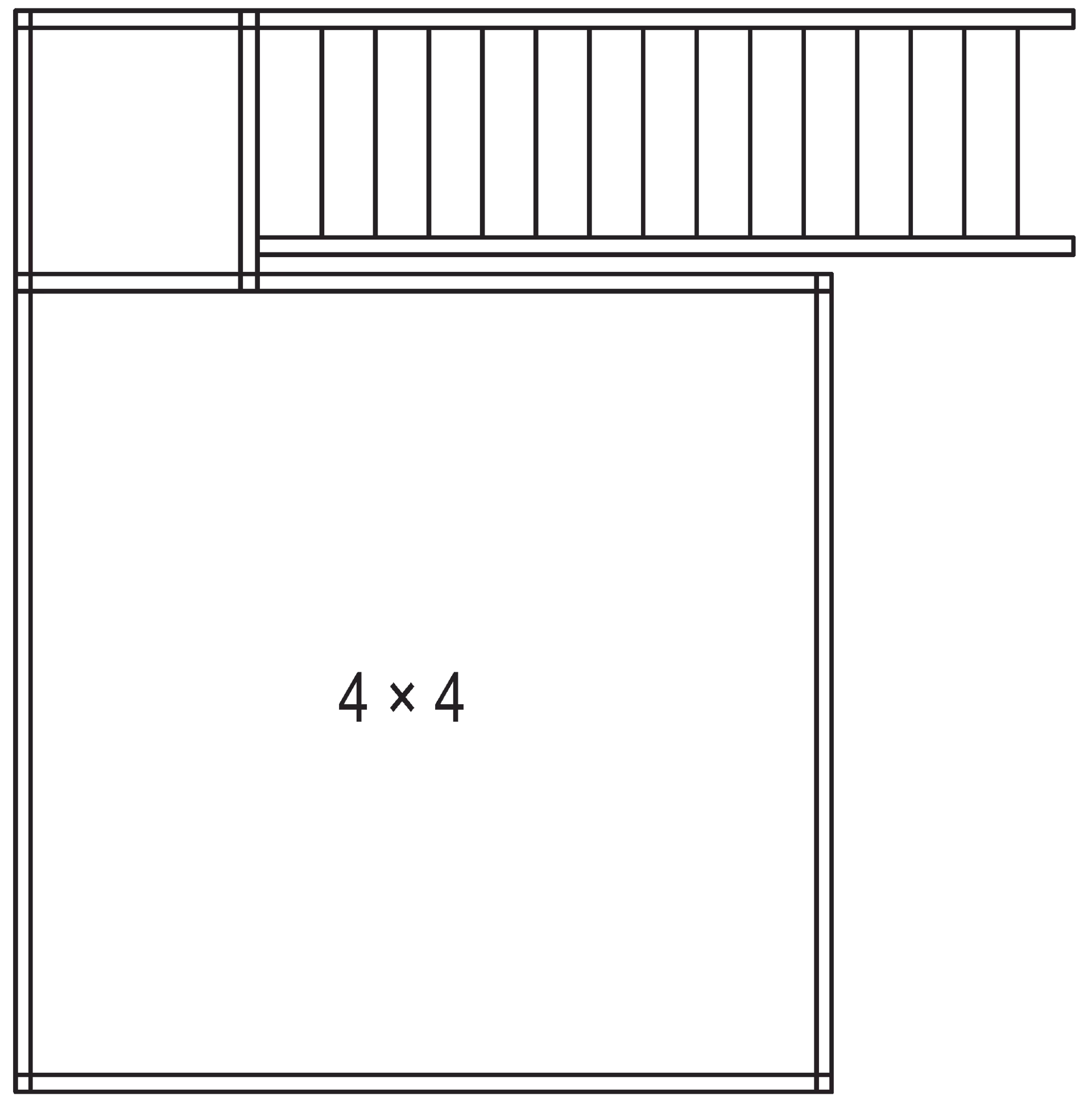 1 × basic module 4 × 4, including Staircase landing, railing supports for parapet height of 1150 mm, single flight of stairs 35° right, 14 × step DFL 532, not included: walkable floor disc (2 × 19 mm) and parapet infills