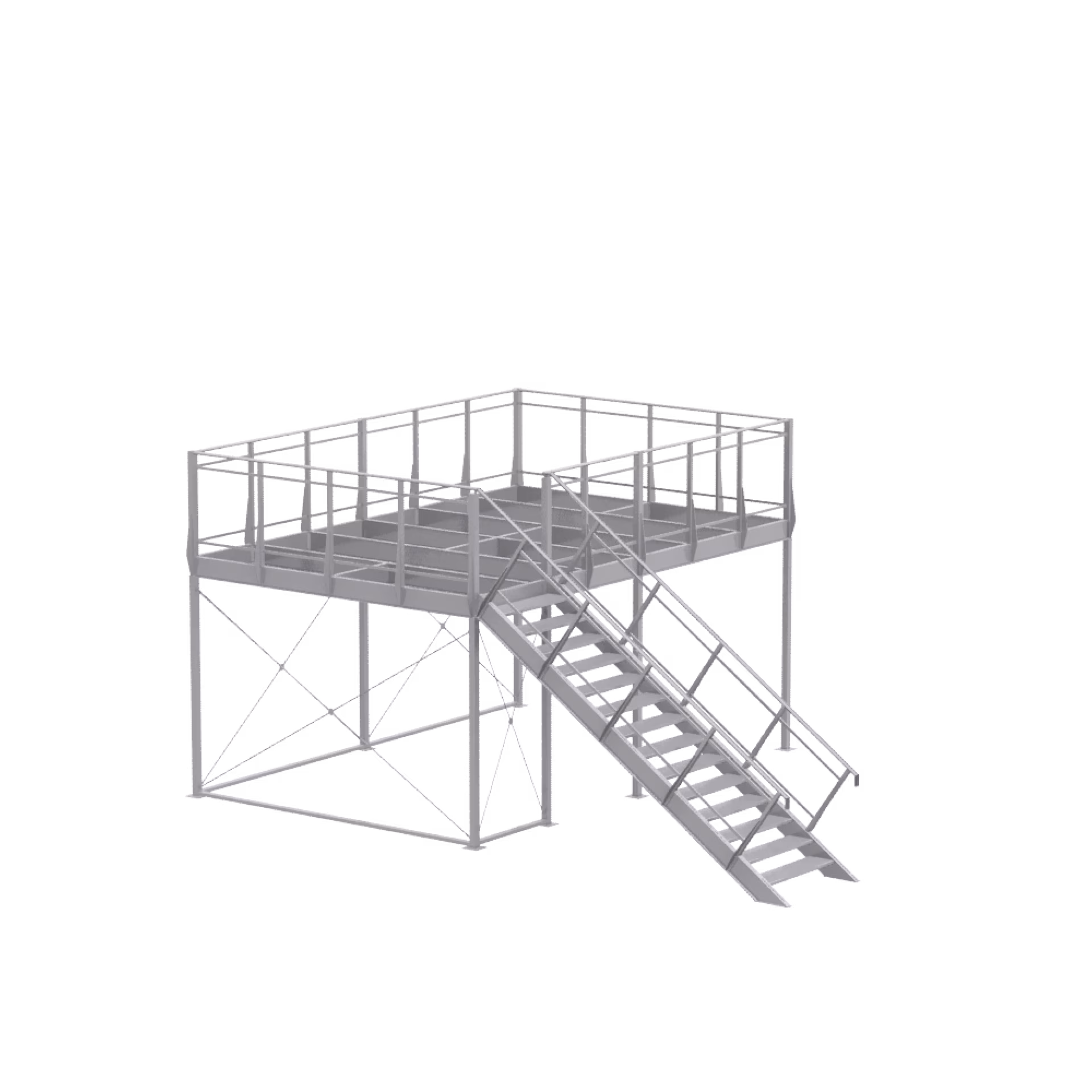 1 × basic module 3 × 4 and extension module 3 × 4, including railing supports for parapet height of 1150 mm, single flight of stairs 35° left, 14 × step DFL 532, not included: walkable floor disc (2 × 19 mm) and parapet infills